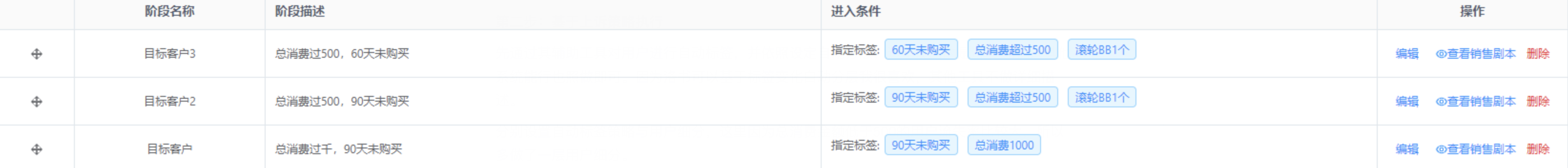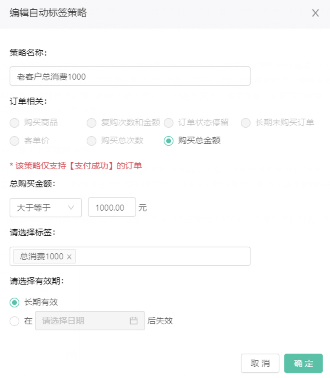 分別設(shè)置自動(dòng)標(biāo)簽策略與用戶細(xì)分,這里因?yàn)榭傁M(fèi)金額低于500的用戶流失率比較大,所以多做了一層用戶細(xì)分。