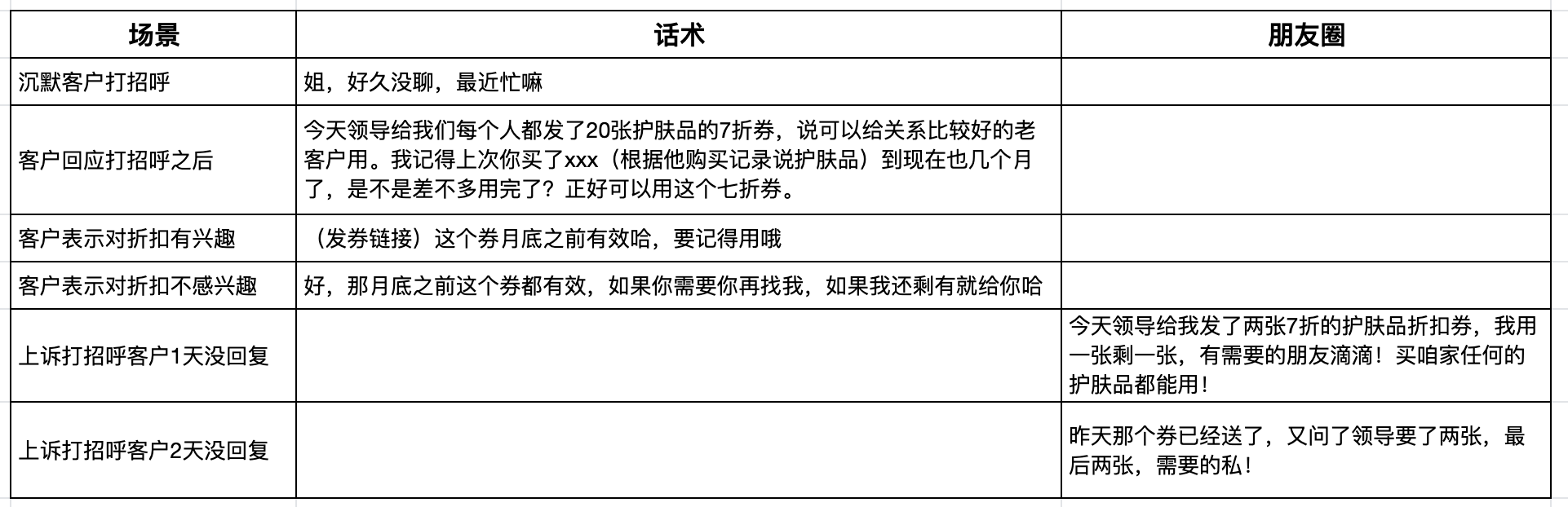 用戶分層后,為執(zhí)行人員準(zhǔn)備一份SOP話術(shù),針對(duì)每一類用戶1對(duì)1單獨(dú)營(yíng)銷。前面的文章我有說過,慢就是快,沒有精細(xì)化工具的話不要群發(fā),手動(dòng)找到目標(biāo)客戶,一個(gè)一個(gè)發(fā)。