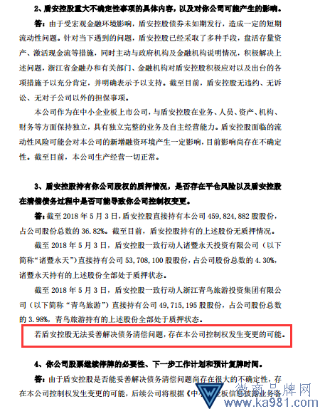 5月4日,江南化工回復(fù)深交所問詢函稱,截至2018年5月3日,盾安控股直接持有本公司459,824,882股股份,占公司股份總數(shù)的36.82%。截至目前,盾安控股持有的上述股份無質(zhì)押情況。KhS
