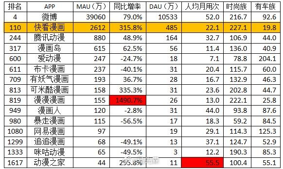 【快看漫畫】擁有5300+萬用戶,月活躍度不到50%,人均月用次未達到1次/天。