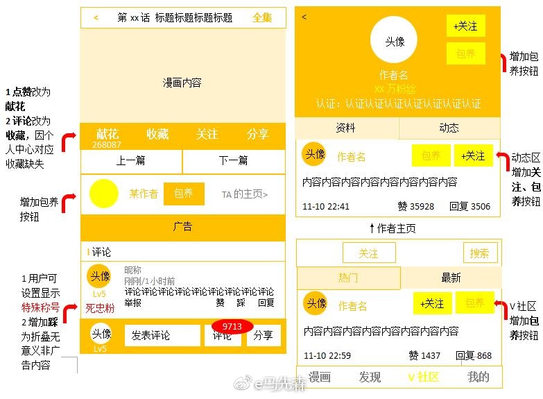 實現(xiàn):類似于打賞功能,但由于漫漫漫畫已經(jīng)有了打賞功能,介于某些歷史原因,不能重復(fù)此功能,故在作者V區(qū)中,增加包養(yǎng)功能,在每期漫畫下方作者后增加包養(yǎng)按鈕,評論區(qū)同步顯示。