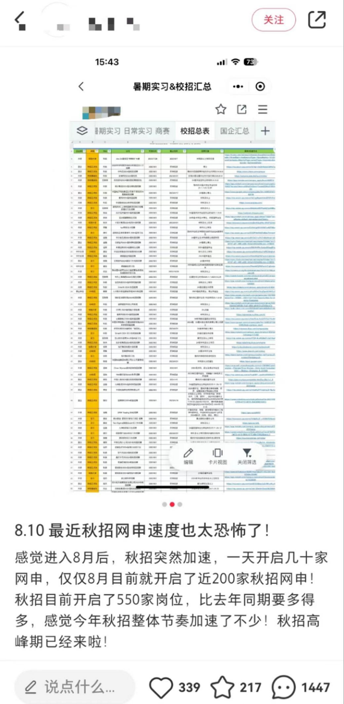 有網(wǎng)友在整理秋招信息時(shí)發(fā)現(xiàn),進(jìn)入8月后秋招突然加速,一天開啟幾十家網(wǎng)申,僅8月目前就開啟了近200家秋招網(wǎng)申。