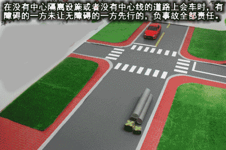 18、在沒有中心隔離設施或者沒有中心線的道路上會車時,有障礙的一方未讓無障礙一方先行的,負事故全責。(重點注意)