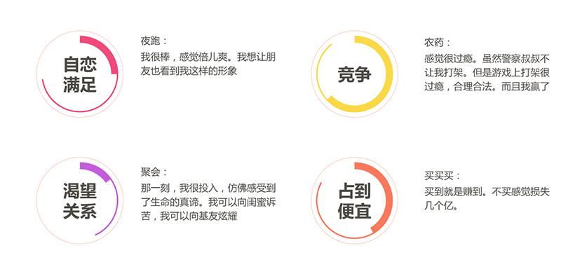 從夜跑中,我們可以給到用戶自戀滿足的感覺,什么叫自戀滿足呢?“自戀”這個詞并不是貶義詞,從心理學(xué)上看它更像是一個中性詞,甚至是褒義詞。因為如果沒有自戀,就沒有今天這個社會。每個人或多或少都會自戀,但如果自戀過度別人就會覺得你是蛇精病。之前有個小伙因違規(guī)被交警扣車,那小伙說自己是銀河系的富二代,如果交警敢扣車,就要毀滅地球,這就屬于過度自戀。