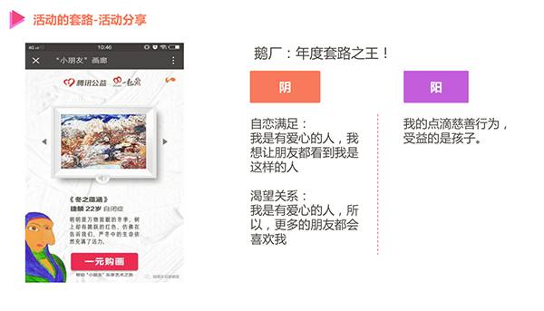 上邊提到的兩個例子,其實都只是利用用戶的某一種心理,令活動得到傳播。而騰訊公益的“‘小朋友’畫廊”活動,卻不單單是利用用戶的心理。我認(rèn)為騰訊公益的這個活動同時具備陰陽兩面。