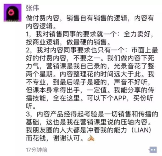 張偉本人也發(fā)朋友圈表示銷售和內容各有各有邏輯和套路,銷售上要“全力賣好,按商業(yè)邏輯,做最硬的銷售。”,而內容上也要做市面上最好的付費內容。
