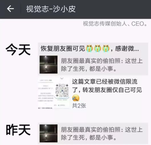 但隨后創(chuàng)始人沙小皮就在朋友圈發(fā)文說文章已經被限流,用戶分享到朋友圈只有自己能看到,作者楠瓜也表示,早上9點文章閱讀已達900萬,但直到中午11點才突破千萬。