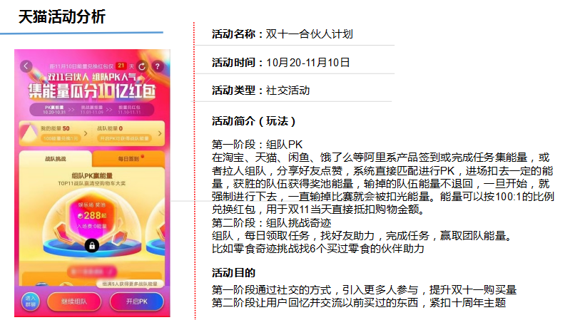 今年升級(jí)的點(diǎn)是雙十一合伙人計(jì)劃,算是火炬紅包的升級(jí)版,理想城算是品牌街的升級(jí)版。天貓活動(dòng)豐富,基本上述四種活動(dòng)都有,再配合上有趣的玩法,采取營(yíng)銷組合拳的方式,長(zhǎng)期刷屏,所以大家參與度高。