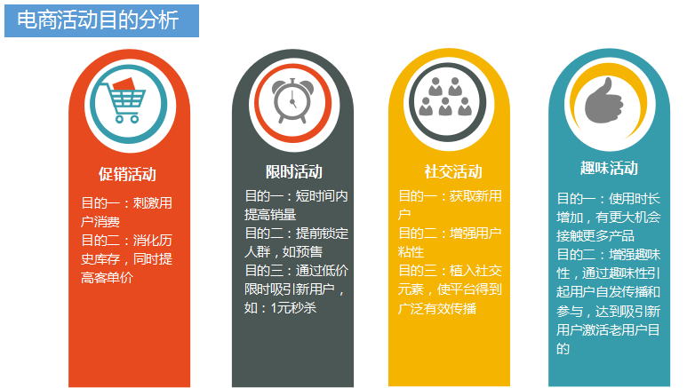 我總結(jié)了一下,電商常見(jiàn)活動(dòng)套路主要為促銷活動(dòng)、限時(shí)活動(dòng)、社交活動(dòng)、趣味活動(dòng)四大類。