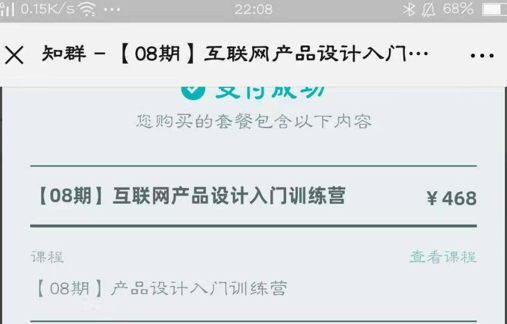 特別是支付完成后,跳轉(zhuǎn)出的課程列表顯示課程仍是468元的小設(shè)計,這個小細(xì)節(jié)能讓用戶真切感受到課程的超值(就像明明花了1000元,但你只需要我給10元)。