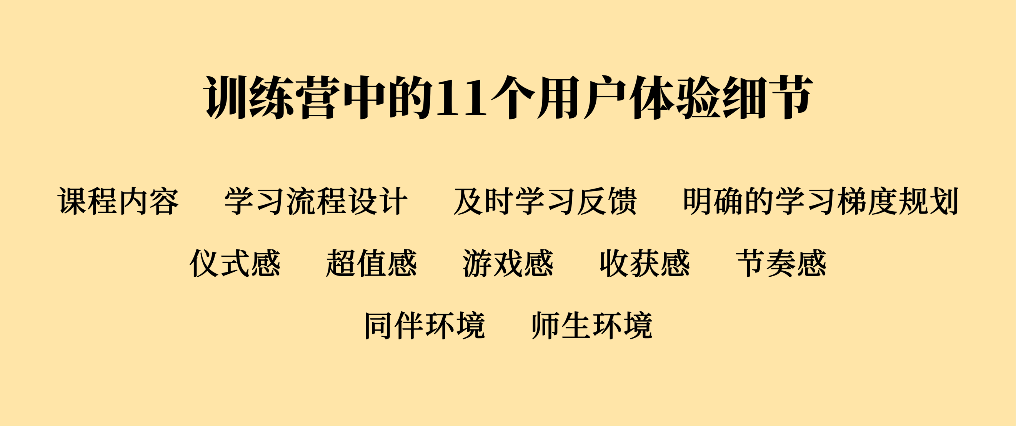 用戶體驗細(xì)節(jié)這方面,之前木公子提出了影響訓(xùn)練營用戶體驗的11個要素,引用一下,就不贅述了詳細(xì)內(nèi)容可搜文章看: