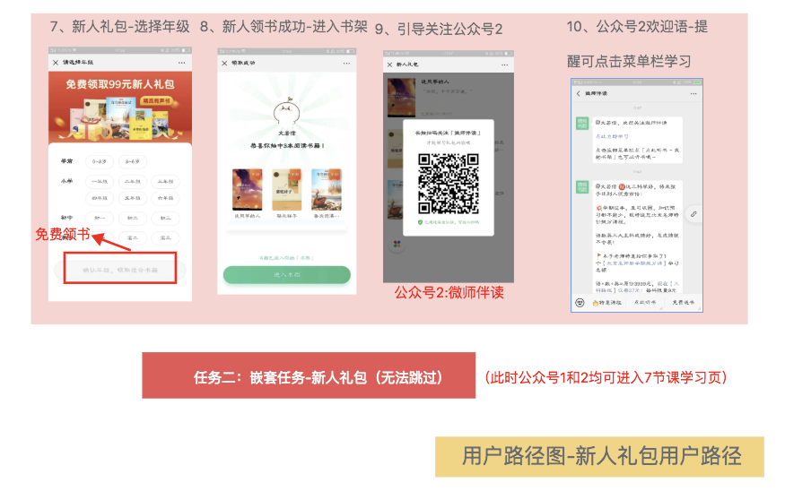 新人禮包任務是活動中的嵌套任務,與1元支付報名課程和解鎖課程任務并無太大關聯(lián),運營者為了增加用戶留存的平臺,強制要求完成。但并非所有用戶都需要這3本新書,一般用戶可能對此產(chǎn)生反感,從而影響用戶體驗。