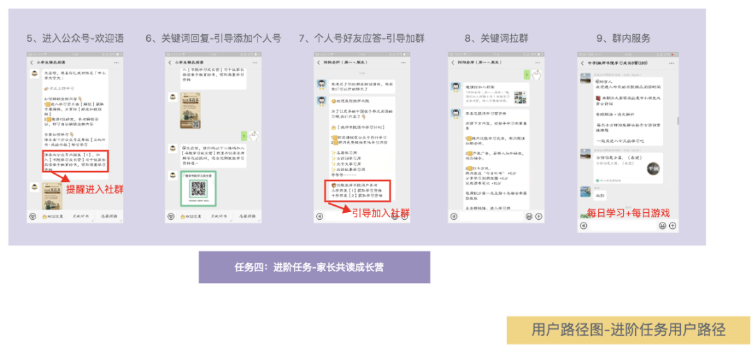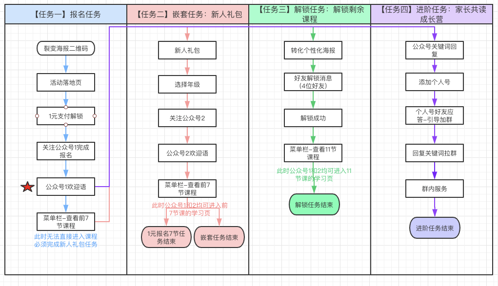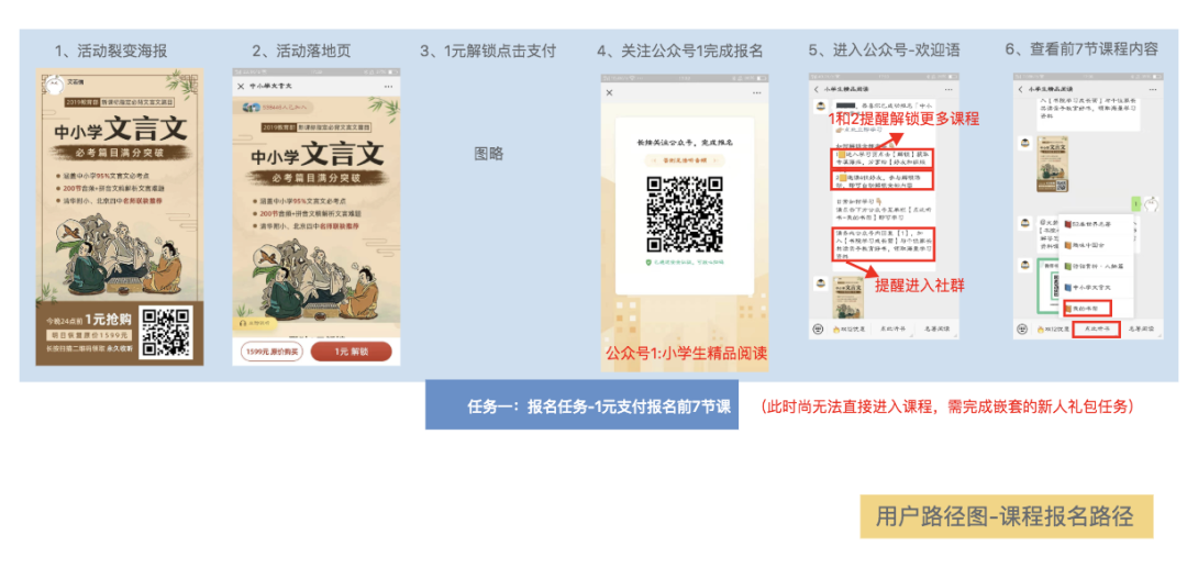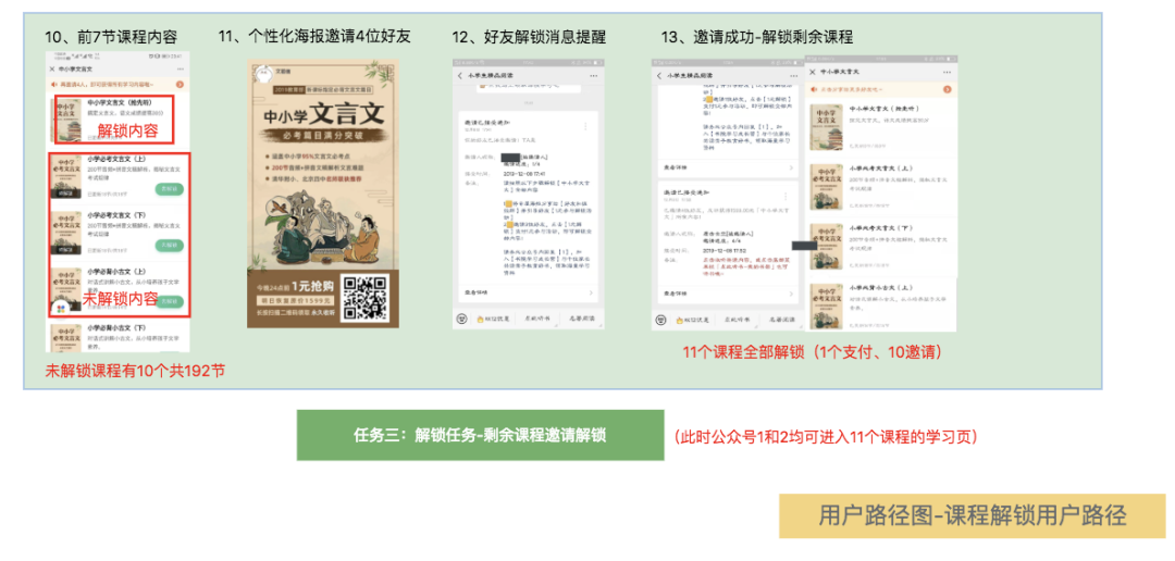 一個活動套四個任務。本案例中,若用戶全部完成所有動作,需要完成1元支付任務、嵌套任務、解鎖任務和進階任務共4共任務。通過2個公眾號+1個個人號+多個社群完成用戶留存,方便多渠道觸達用戶。