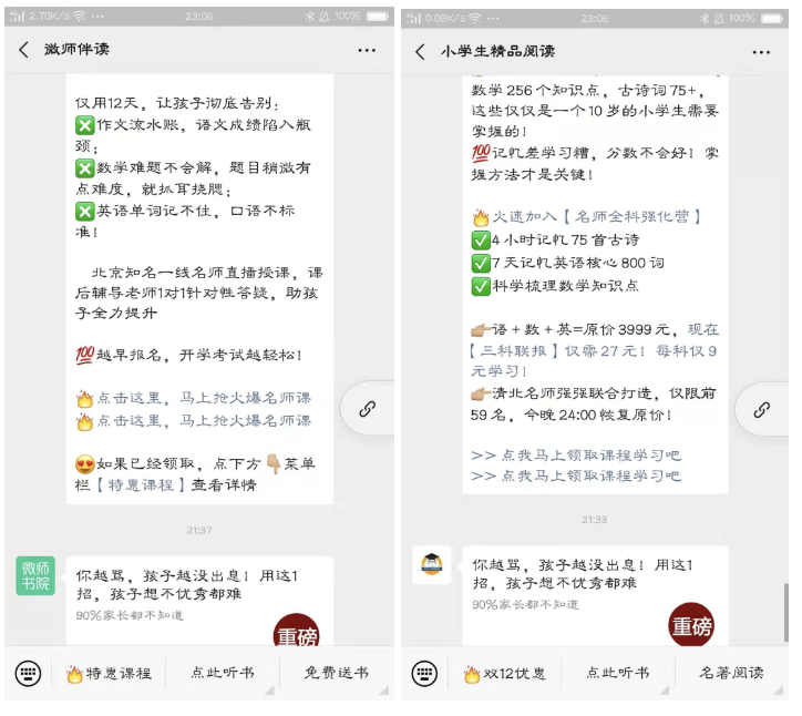 公眾號提醒用戶可以加入微師會員社群,和千位家長一起參加共讀成長營,并可獲得海量學習資料。利用用戶的焦慮心理,完成添加個人號和進入社群的動作。