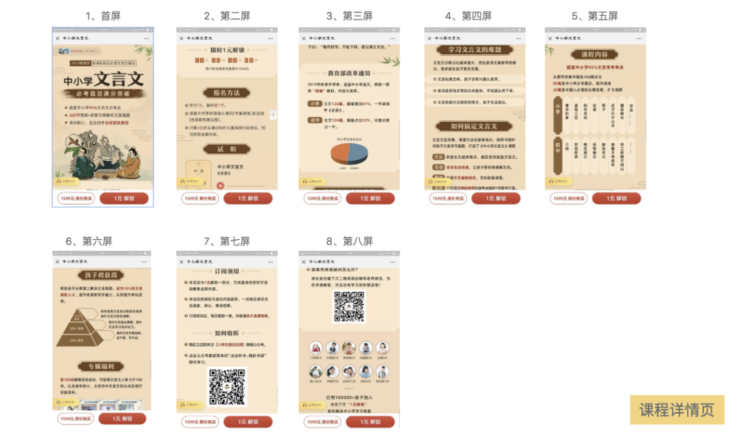 掃描裂變海報二維碼,進入活動詳情頁發(fā)現(xiàn)內(nèi)容非常多,前后共有8屏來講為什么學、課程講什么、如何報名,內(nèi)容太過冗雜,特別是報名方式在最后,需要劃很久才到達。