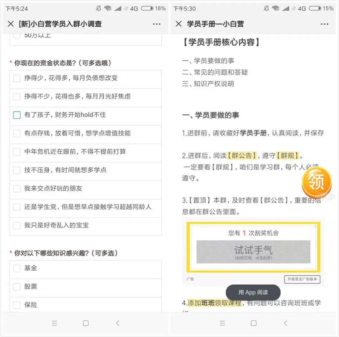 加上學(xué)委后發(fā)入營問卷,完成這份問卷有助于收集學(xué)員信息,進行用戶分層。而簡單的發(fā)出來,并沒有有效的鼓勵或者必須完成的要求來讓大家完成,可能學(xué)員可能就不完成了。可以在開始時增加問卷完成獎勵,以及開營前多次提醒完成,提高完成率。
