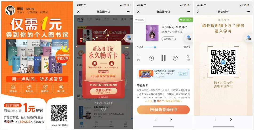 (1)掃碼后進入圖書館首頁,點擊各板塊(除已解鎖書籍區(qū))及右下“終身學(xué)習(xí)卡1元領(lǐng)”浮層點擊均彈出活動提醒,引導(dǎo)付費。