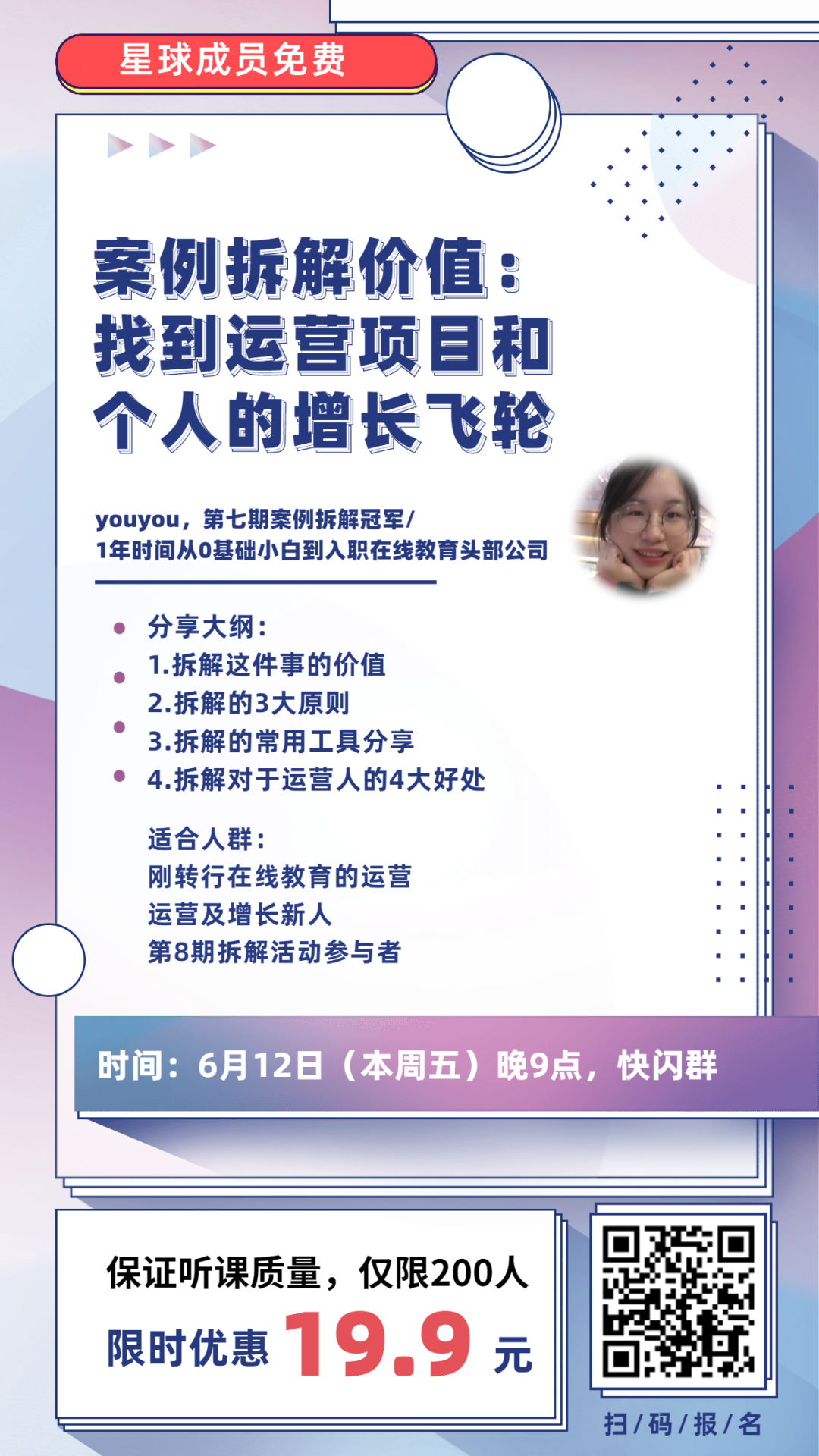 松月又來發(fā)布學(xué)習(xí)通知啦,本周的集體學(xué)習(xí)臨時提前到周五,松月邀請來youyou(第七期案例拆解冠軍/1年時間從0基礎(chǔ)小白到入職在線教育頭部公司),帶來分享《案例拆解:找到項目和個人的增長飛輪》,掃碼報名(報名截止6月12日晚8點,過期報名不拉群):