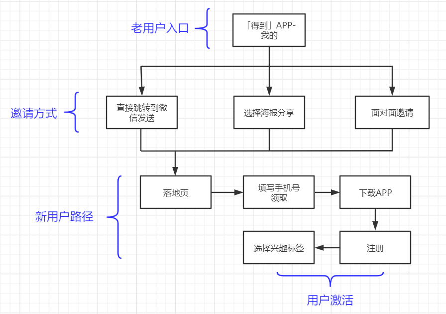我們可以用AARRR模型來分析一下這里涉及的生命周期階段。首先這個活動是促進(jìn)用戶推薦傳播,從而獲取用戶。這里其實就是老帶新,但是「得到」不止于此。