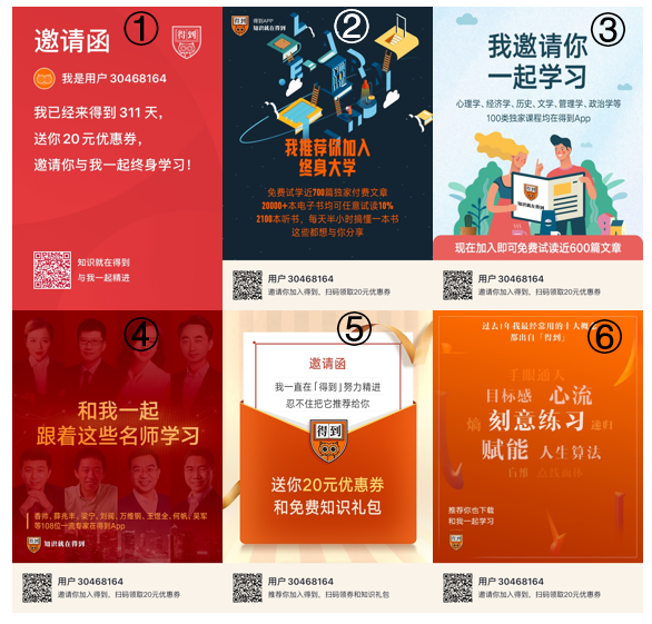 可選擇的海報一共有6張,可分為邀請函和海報兩種形式,主要應(yīng)用了海報要素中的信任背書與利益性。