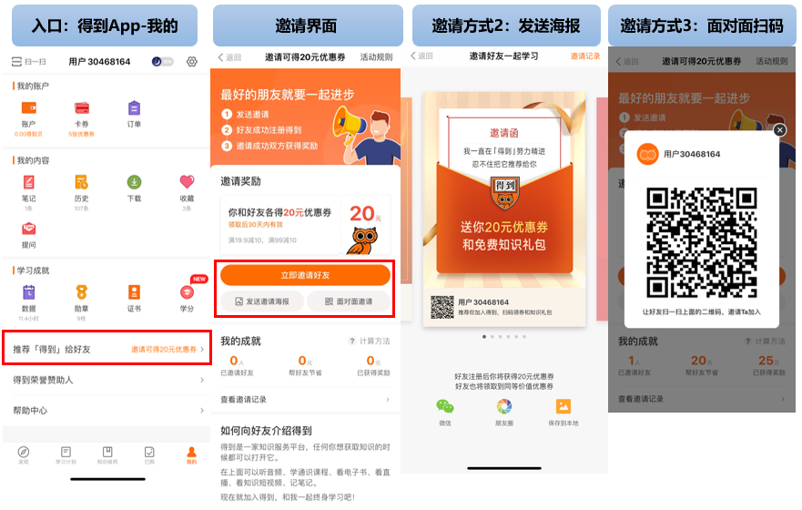 該案例規(guī)則是邀請好友注冊「得到」,雙方各得20元優(yōu)惠券,可重復(fù)參加。