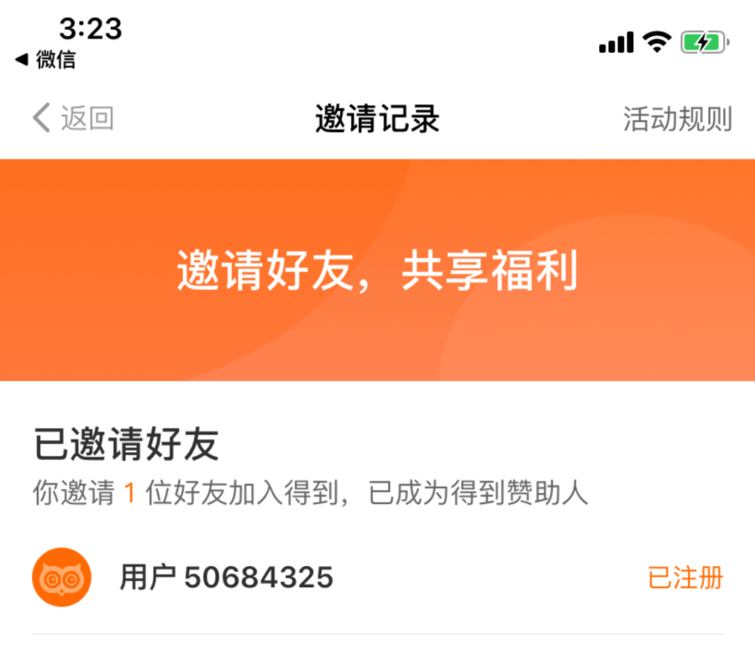 在邀請記錄中,只顯示好友昵稱與已注冊,領(lǐng)取后若未注冊則不顯示。這更像是一個成果展示,但是可以進(jìn)一步優(yōu)化為分享動力。