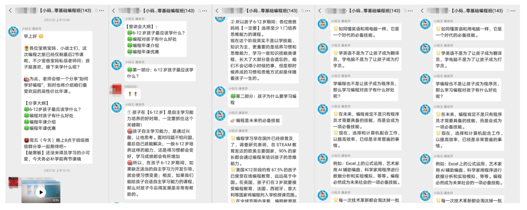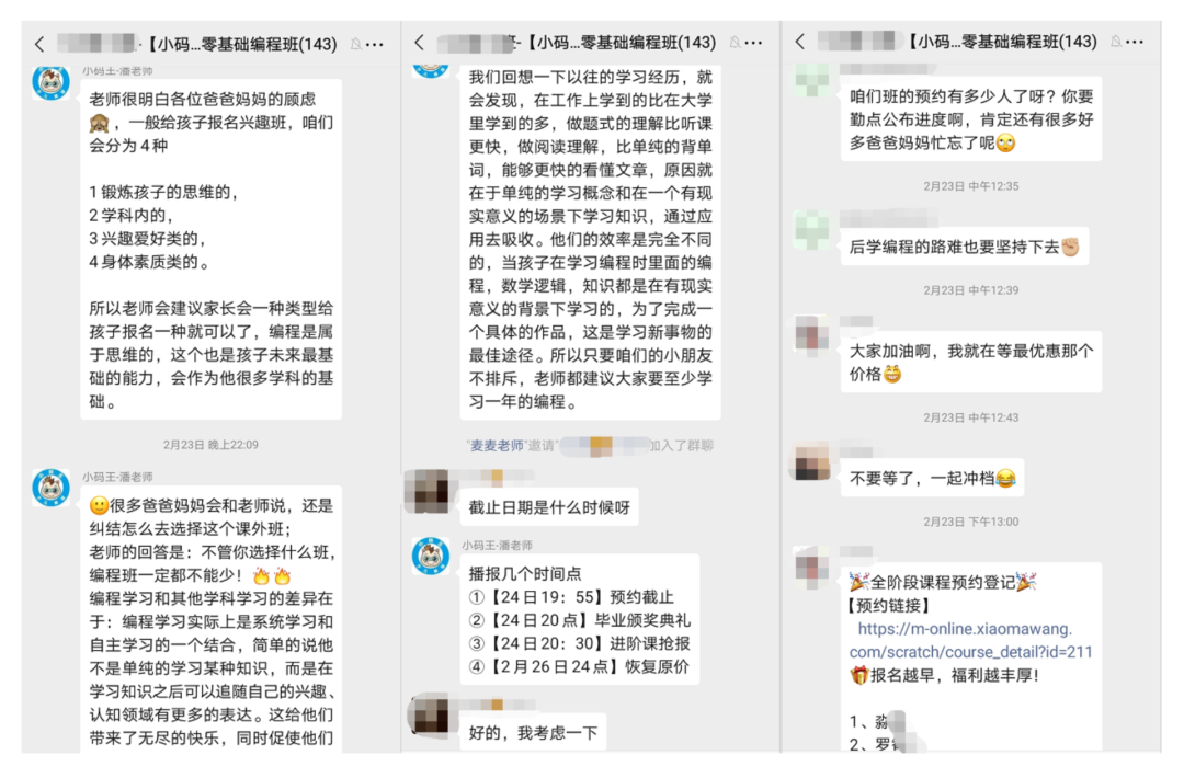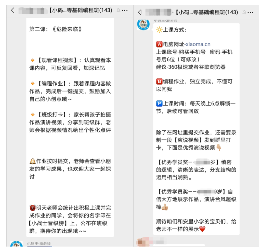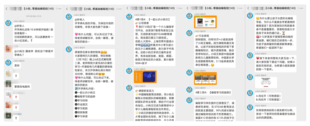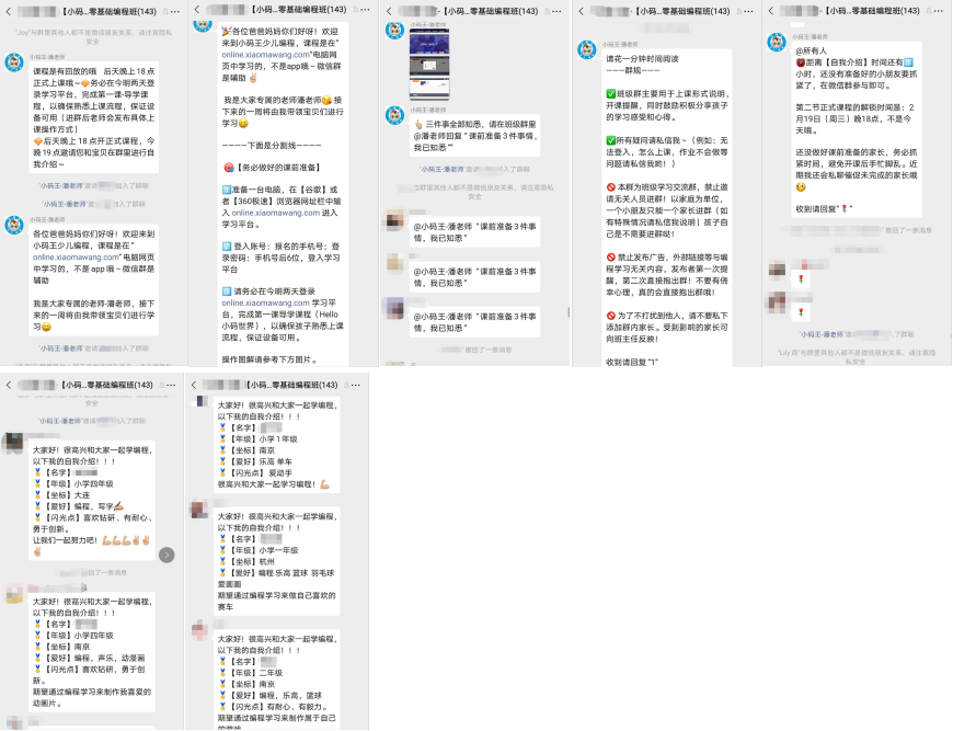 對于小碼王第一次純線上嘗試從體驗(yàn)課到正價(jià)課的模式,我覺得它的社群運(yùn)營流程很不錯(cuò)。硬要挑的話,建議進(jìn)群環(huán)節(jié)的進(jìn)群歡迎語,講清楚三件事情:上課時(shí)間+上課方式+社群規(guī)則,一次說完整;小碼王這里是分多次去講述的。