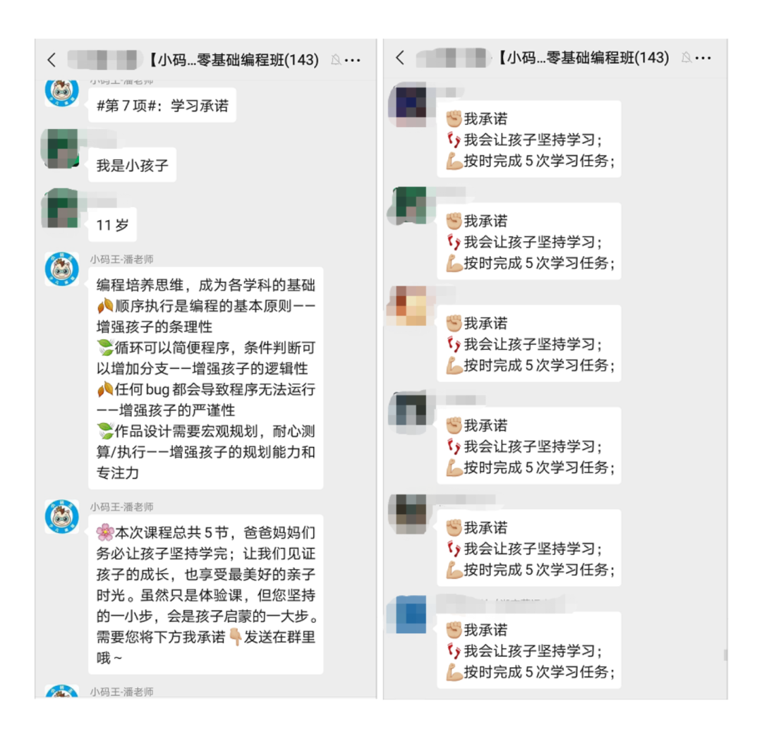 F、學(xué)習(xí)承諾環(huán)節(jié)設(shè)計(jì)的很不錯(cuò),不僅僅是小碼王對學(xué)員的學(xué)習(xí)承諾,同時(shí)也是家長對孩子的學(xué)習(xí)承諾。通過接龍?jiān)靹?,為開學(xué)典禮的結(jié)尾起到畫龍點(diǎn)睛;讓家長再次自我明確學(xué)習(xí)目標(biāo);潛意識的影響了課程完課率,展現(xiàn)了品牌專業(yè)度。