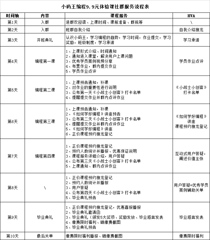 從小碼王的運(yùn)營節(jié)奏來看,訓(xùn)練營產(chǎn)品的7個(gè)運(yùn)營環(huán)節(jié):進(jìn)群環(huán)節(jié)、開營儀式、上課環(huán)節(jié)、作業(yè)環(huán)節(jié)、社群活動(dòng)、轉(zhuǎn)化環(huán)節(jié)、閉營儀式;它都做的很好,能讓用戶在每個(gè)環(huán)節(jié)產(chǎn)生HVA。