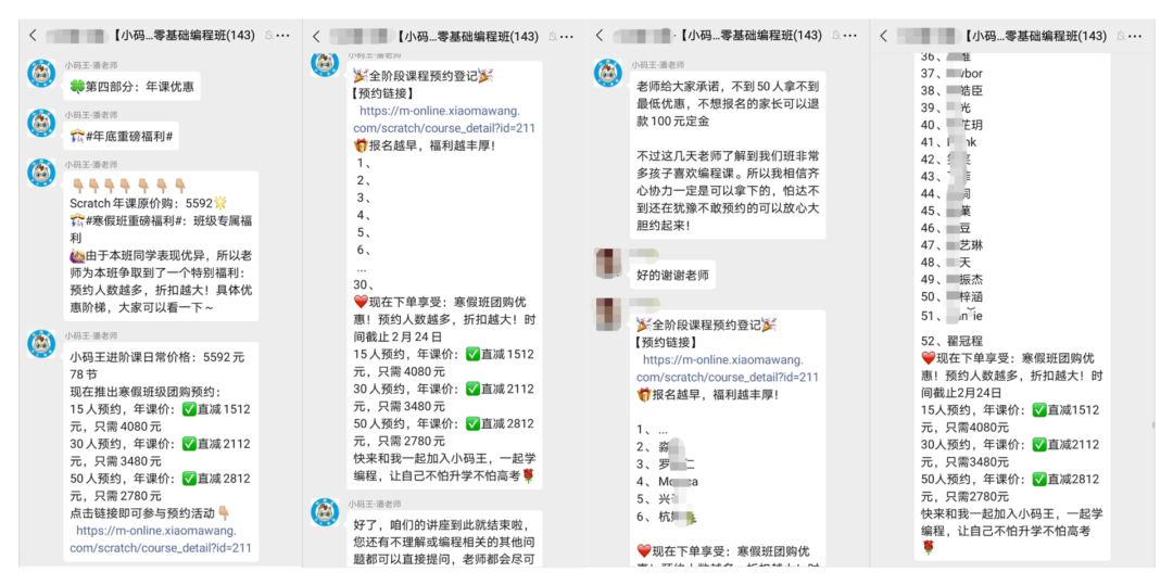 用戶點(diǎn)擊鏈接預(yù)付100元押金,然后群內(nèi)接龍的方式進(jìn)行課程預(yù)約登記。這里想著重說的是后種預(yù)約登記方式,前者是大家的常規(guī)手段;但是群內(nèi)接龍進(jìn)行預(yù)約登記的可操作性強(qiáng),而且易形成刷屏效果,通過高頻次的接龍播報(bào)。不斷刺激家長,在高頻次的刺激下,加以社群從眾效應(yīng),用戶參與預(yù)售的可能性能翻倍。