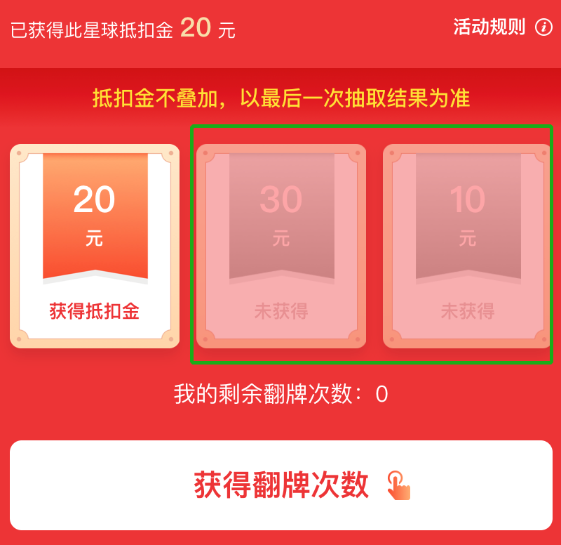 1、用戶刺激力度不夠:每一次翻牌時(shí)有三張牌,系統(tǒng)會(huì)隨機(jī)翻取一張牌,如翻出了20¥的抵扣金,另外兩張牌的金額應(yīng)>20¥,如50¥、100¥等,讓用戶更有動(dòng)力去分享海報(bào)獲得再一次的抽價(jià)格機(jī)會(huì)