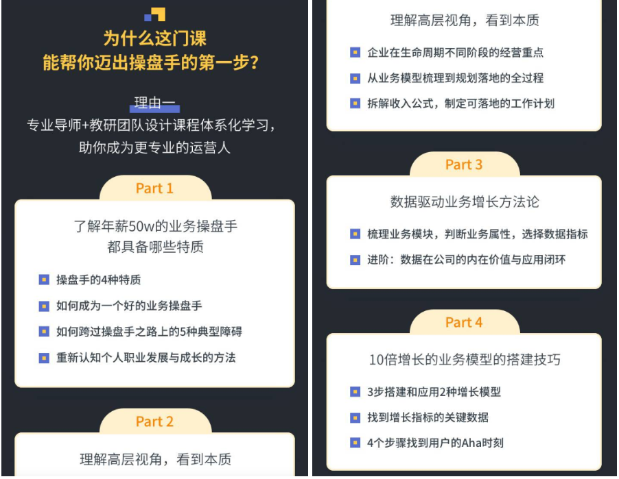 因為有專業(yè)導師+教研團隊設(shè)計課程,可以讓你體系化學習,并且列舉出四個課程模塊,從操盤手特質(zhì)、與高層同頻到業(yè)務(wù)模型的搭建與業(yè)務(wù)增長,刀刀切中運營人的要害,非常有利的證實了課程是有質(zhì)量保障的;