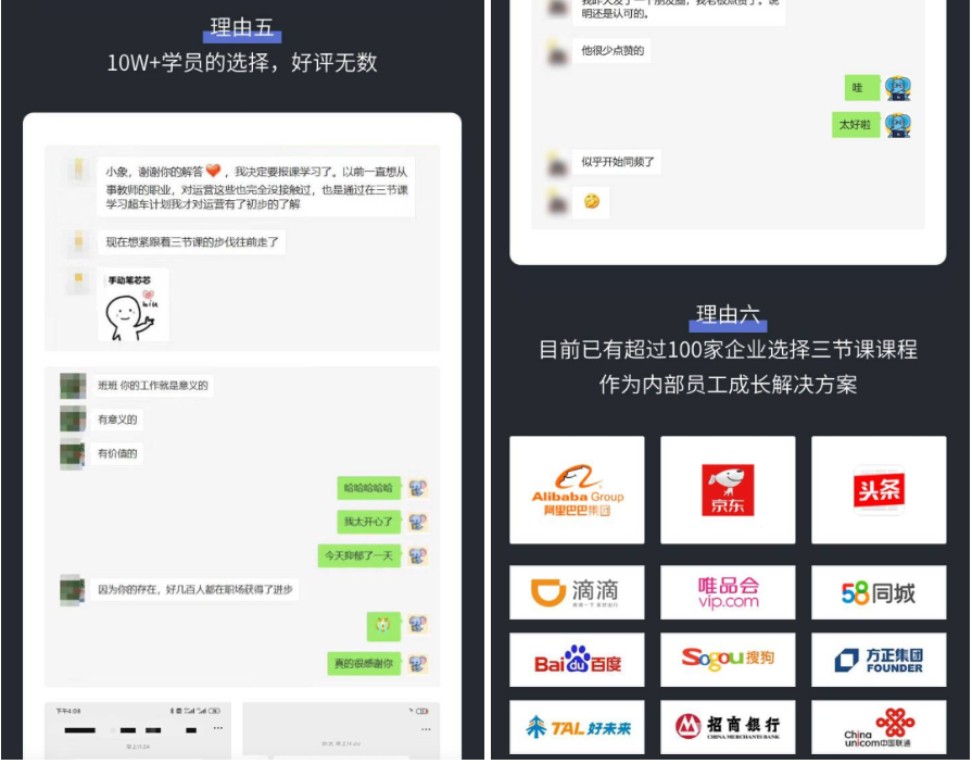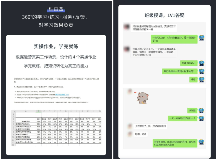 真實案例驅(qū)動教學,讓學生真正做到學以致用,并且通過展示優(yōu)秀學員的精致作業(yè),來實質(zhì)化的展現(xiàn)課程可以帶給你的價值與提升;并且還有練習+服務(wù)+反饋,讓你真正做到學以致用;同時,這里使用了微信聊天記錄截圖,來表示服務(wù)的真實性;
