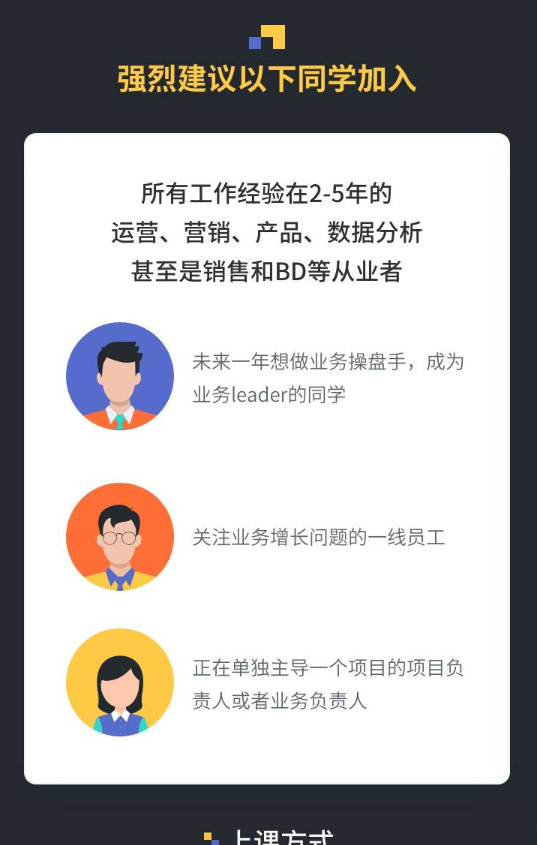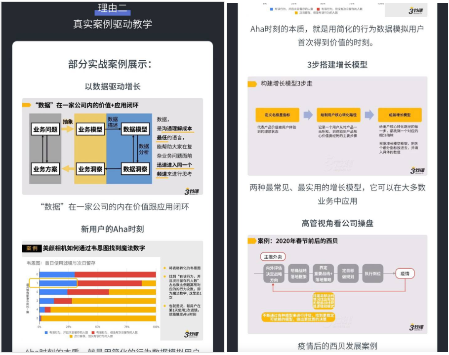通過幾大理由的敘述,很好的解決了用戶的焦慮問題;例如理由2,真實案例驅(qū)動教學;做運營的同學都清楚,理論知識都看的不少,但是實際操作才知道相差甚遠....有太多理論并不代表就能做好運營,而通過真實案例的學習可以很好的緩解這個問題;