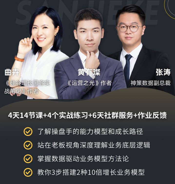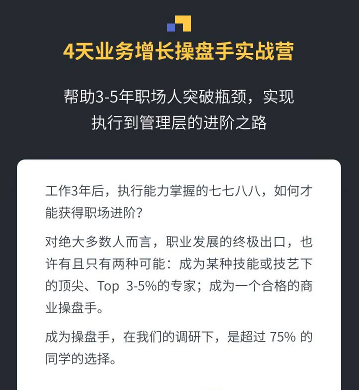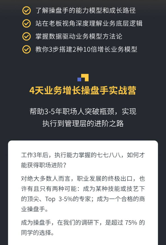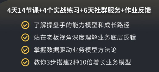 4天業(yè)務(wù)增長操盤手實戰(zhàn)營,內(nèi)含4天14節(jié)課+4個實戰(zhàn)練習+6天社群服務(wù)+作業(yè)反饋;