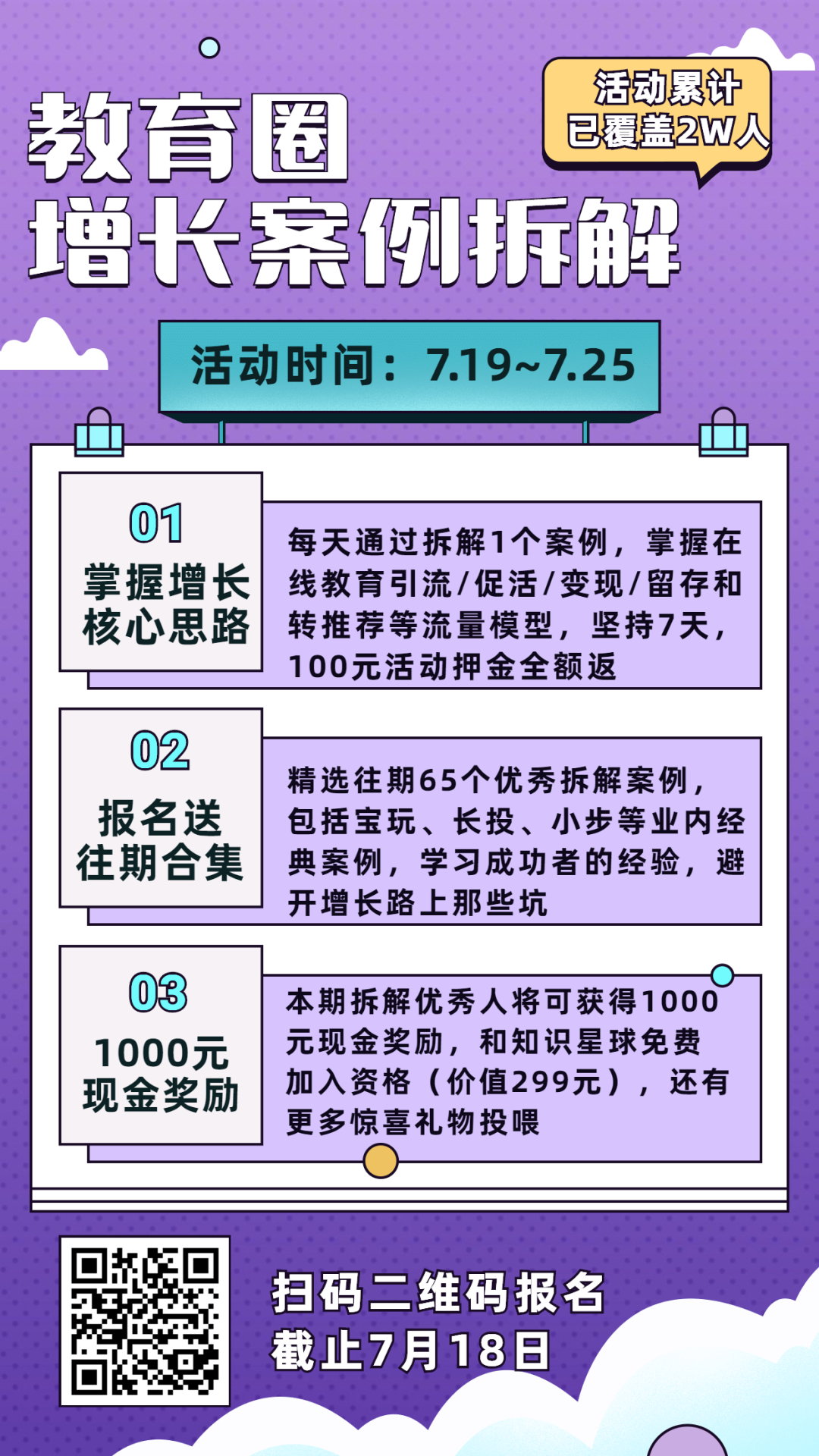 活動時間7月19日~7月25日,7天時間每天需完成1個教育圈(僅限在線教育和知識付費領(lǐng)域)增長案例拆解和自測題,活動結(jié)束后100元押金全額返還(最好自己找案例更有針對性,同時我們也提供案例庫)