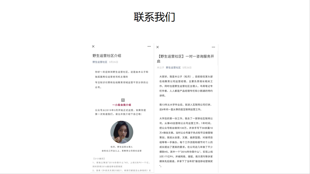 野生運營社區(qū),定位于知識付費和在線教育的運營行家、第一社區(qū);從定位可以了解到,這個公眾號不單單是只想做一個公眾號,后續(xù)可能還會向著運營行家社區(qū)來發(fā)展,所以其勢必會招攬此領(lǐng)域內(nèi)的優(yōu)質(zhì)運營人加入,不斷壯大隊伍;