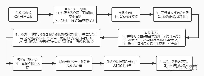 社群搭建及運營實操攻略的上集,主要講了如何通過三個步驟做好社群運營工作。主要包括明確社群定位、制定社群制度以及社群內(nèi)容的核心。還講了關(guān)于5W1H中5W的問題,其中如果有小伙伴沒有看過的可以先去了解一下:社群搭建及運營實操攻略(上):3步教你如何做好社群運營 當(dāng)然如果想要真正做好社群運營工作,光有這些還是不夠的。三步做好社群運營更多的是基礎(chǔ)工作,或者說是先決條件,它們決定了你的社群起始點在哪里,也就是底線問題。而今天我們來聊得則是社群運營的高度問題,也就是說當(dāng)你的社群做好了前面三步,基本可以保證你的社群不會死,也能有效的運營起來,但是至于這個能達到什么樣的高度,產(chǎn)出怎樣的效益,則是這個下篇的重點: 社群搭建及運營實操攻略的下篇主要會講:社群活躍、社群轉(zhuǎn)化(也就是5W1H中HOW)的問題。 社群活躍 一:設(shè)置入群門檻 想要讓運營的社群長期保持一個活躍的狀態(tài),首先我們需要先明確社群的目標(biāo)用戶,也就是群成員的構(gòu)成。因為上文有講過,社群就是一群有共同興趣、認知、價值觀的人抱成團。然后在一起互動、交流、協(xié)作、感染。所以社群活躍其實就是群內(nèi)成員的活躍。 所以我們在運營社群的時候,一定要設(shè)置相應(yīng)的加入門檻。即使是免費的社群,也需要一定的要求才能入群。如果純粹只是為了群人數(shù),不管其他,那么人人可以進入后所造成的結(jié)果就是:沒有共同屬性、沒有共同話題,最終越來越少的人愿意溝通,直至變成死群。 所以設(shè)置合適的入群條件,是保證社群活躍的第一點,也是先決條件。如果這一步?jīng)]有做好,后面所有的都是無用功。 二:入群儀式感 社群有一個天然的屬性就是社交。所以不管入群的初衷是什么,只要涉及到社交的話題,那么關(guān)于人性的問題就應(yīng)該被重視。 而在社交過程中,幾乎每個人內(nèi)心都會有一種渴望,那就是被重視。所以關(guān)于入群這個事,每個人在最初進入時都會希望引起別人的關(guān)注。所以一個優(yōu)秀的社群運營人員,在關(guān)于新人入群這件事上會設(shè)置非常巧妙的辦法。那具體怎么設(shè)置呢? 不知道有多少小伙伴在上學(xué)的時候經(jīng)歷過轉(zhuǎn)學(xué)?或者班上有從其他學(xué)校轉(zhuǎn)過來的新生?回想一下那個場景,是不是有新生到班上的時候,老師都會在課堂上公開介紹這名同學(xué),還讓他自我介紹一下? 所以,我們在設(shè)置新人入群時也可以參考這個場景。 然后我們再換位思考一下,每一個剛?cè)肴旱男氯怂麜惺裁礃拥膯栴}?我拿自己舉例,我本身從事運營工作,所以平時加的社群也都是運營類的社群,而每當(dāng)我要加一個社群時,我都會有下面這些疑問: 這個群是一個什么樣的群? 群友大多是什么類型的? 這些群友平時喜歡聊什么? 我如果入群后應(yīng)該怎么做自我介紹? 我可以先跟誰聊? 群內(nèi)有哪些大神?分別擅長什么領(lǐng)域的運營工作? 當(dāng)然不同行業(yè)和領(lǐng)域的社群,問題會不一樣,這就需要我們的社群運營人員對于社群定位、用戶調(diào)研等做好詳細的工作了。 說了這么多,那到底怎么做才能讓用戶入群有儀式感呢?我拿前段時間我加的一個群來舉例: 我加入這個群的整個用戶路徑: 群內(nèi)的新人自我介紹大致是下面這些內(nèi)容(我截取了其中一位新人): 我加入的這個群是一個付費群,按年付費,這個群是一個運營交流群,群內(nèi)都是相關(guān)從業(yè)者,平時在群內(nèi)分享一些關(guān)于運營方面的知識、心得等。 該群并不是你一付費就立馬入群,而是由客服先跟我一對一的溝通,在這個過程中,基本上解決了我入群時可能會涉及到的問題(就是前面我舉例的那些問題)。所以就我個人而言,在入群過程中,充分滿足了我的虛榮心,讓我感受到一種被重視的感覺。瞬間覺得自己花的錢挺值的。 三:群成員成長體系 1:積分體系搭建 社群搭建積分體系幾乎是目前所有社群運營工作者都會運用的一種手段,積分體系的好處是能夠協(xié)助運營者將社群運營、管理效率提升數(shù)倍,讓社群客戶管理規(guī)范化、專業(yè)化,也更加系統(tǒng)化。 在搭建積分體系的時候需要注意四個核心點: 核心一:積分體系的搭建必須圍繞社群核心目標(biāo)來設(shè)計 圍繞社群核心目標(biāo)就是說,群成員在獲取積分的過程中,所采用的動作行為都是以最后的轉(zhuǎn)化為目標(biāo)的。例如下面這個社群的積分體系: 群內(nèi)成員獲取積分的所有動作,都是為來促使成員最后下單買衣服。成員看到群內(nèi)的買家秀就會促動買衣服的欲望,然后買了衣服秀買家秀,可以獲得積分,而積分還能換取抵扣券,為下次購買做好鋪墊,整個流程形成用戶動作的閉環(huán)。 核心二:積分分級驅(qū)動 相信很多社群運營人員在設(shè)計積分獲取方式時,都會多設(shè)計幾個。比如像上面這個例子,群成員獲取積分的方式,包括買家秀、邀好友入群等等。 而所謂的積分分級驅(qū)動的意思,就是這幾個核心動作最好能形成一個由低到高、由易到難的過程。說白了就是解決一個問題:什么樣的動作可以獲得多少積分?! 這種設(shè)計的好處就是可以增加用戶的參與度。同時不同積分層級可以獲得不同的好處。這樣對于用戶來說,越復(fù)雜的