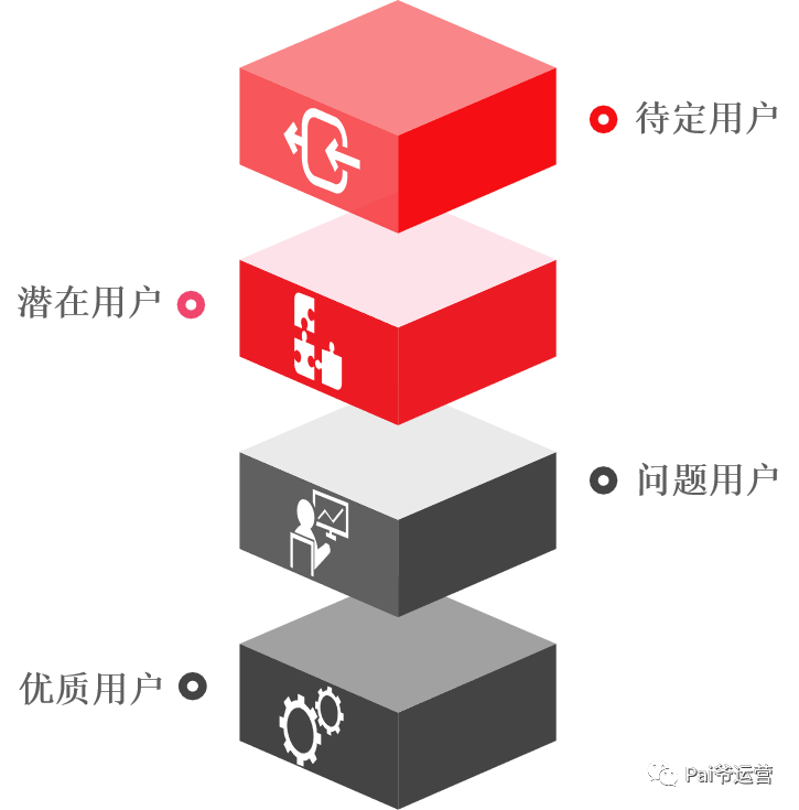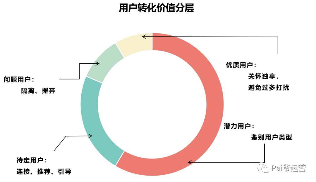 信息促達:社群運營的有效促達可不是簡單的把內(nèi)容發(fā)到群里而已。你至少需要@所有人,然后群內(nèi)成員都知道,同時分發(fā)的文章最好不要直接轉(zhuǎn)發(fā),而是能夠配上一些個性化的文案和圖片為佳。 分為引導(dǎo):上篇中有說過,社群運營的內(nèi)容核心其實是話題,一個優(yōu)質(zhì)話題往往可以激活用戶。所以當(dāng)我們把內(nèi)容推送到群里時除了要@所有人以外,最好可以搭配一個有吸引力的話題,以便于引起用戶共鳴。 豐富品類:雖然說社群的群成員都是因為擁有共同興趣、認知的人聚在一起,但即使是這樣,群成員依然會有不同的需求,所以社群提供的產(chǎn)品或者服務(wù)不能太過單一,最好能夠根據(jù)不同的群成員需求提供不同的服務(wù)。 善用爆款:當(dāng)然一個社群還是需要有一個核心的爆款產(chǎn)品。因為一個爆品可以有效增加用戶粘性。然后搭配一些促銷活動或工具,例如拼團、砍價等,來實現(xiàn)用戶裂變。 動態(tài)定價:關(guān)于這一點,其實很好理解,就是你的產(chǎn)品或服務(wù)不能永遠只有一個價格,可以有所變化。至于變化的依據(jù)可以有多種方式,比如根據(jù)用戶活躍度可以適當(dāng)降低價格或抵扣優(yōu)惠,也可以利用促銷活動來變相地降低價格,如預(yù)售,1-30名可以享受5折,31-60名可以享受7折等等。 通過這五個維度可以有效幫助我們實現(xiàn)群轉(zhuǎn)化的目的。當(dāng)然如果有效 想要實現(xiàn)社群轉(zhuǎn)化,首先還是需要對用戶轉(zhuǎn)化價值進行一個分層: