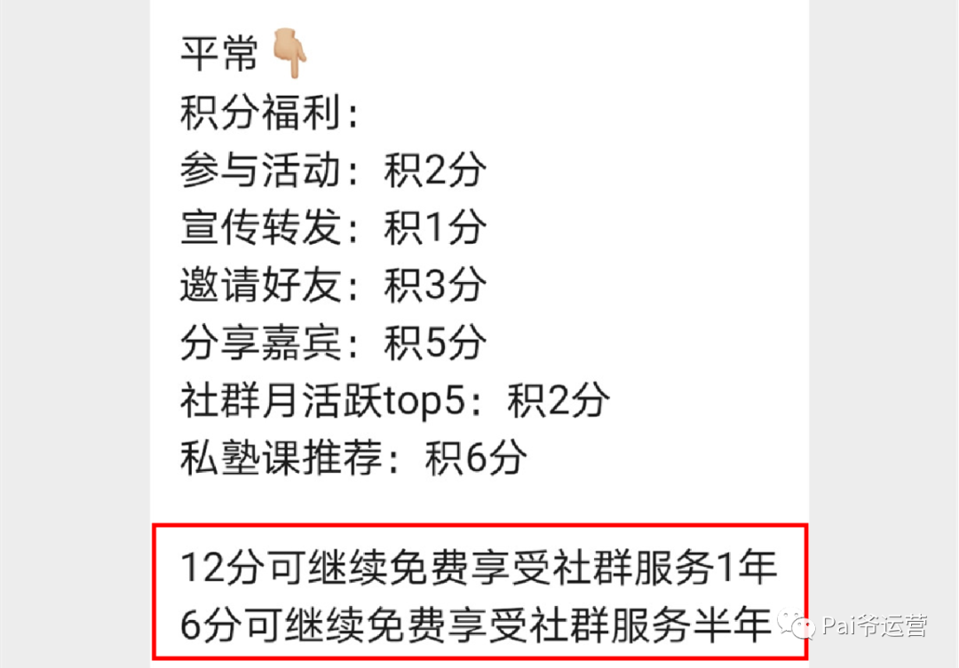 這類社群并不主要銷售產(chǎn)品,而是提供服務(wù)。因為是付費社群,費用是按年計算,所以它的積分獎勵主要以延長社群服務(wù)為主。另外,這個群的積分還有其他用處,比如作為核心成員,獲得新人入群時的重點介紹(在前面圖1:入群路徑圖里有講,客服在對新人介紹社群時會主動介紹一些群內(nèi)的大咖)。又或者根據(jù)成員的核心業(yè)務(wù),進行內(nèi)推等。 作為運營人員,進入一些運營群,除了想學(xué)習(xí)到一些運營的相關(guān)知識,還有一個很重要的原因就是結(jié)識一些同行,并且獲得一些內(nèi)推或者業(yè)務(wù)機會。所以這個積分獎勵可以說是充分挖掘了像π爺我一樣的運營人的內(nèi)在需求。 除了設(shè)計積分獎勵外,還需要設(shè)計積分清零機制,或者說是有效期。這個設(shè)計的好處就是有效激發(fā)用戶,讓用戶在獲得積分后,還能更進一步。這一系列的動作從心理學(xué)上來說,充分利用來沉沒成本+厭惡損失心理+羊群效應(yīng)。俗話說:魚餌越多,收獲越豐厚。 核心四:激發(fā)用戶比較心理 前面三個核心點基本上已經(jīng)把積分體系搭建完了,但是還不夠,需要更進一步。