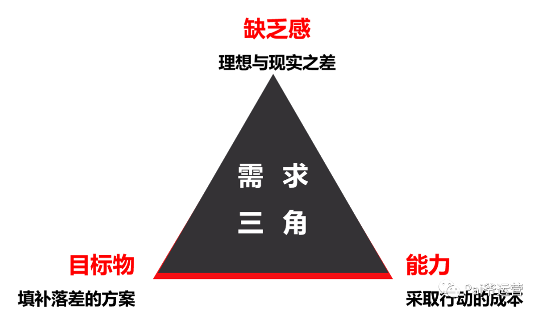 通過這5個維度可以大大提升我們運營社群的轉(zhuǎn)化效果。當(dāng)然這些只是基本的理論,對于0-3年的運營新人而言,首先掌握這些理論然后再結(jié)合實操,總結(jié)經(jīng)驗后可以加速提升我們的運營能力。 這里π爺再給各位小伙伴提一個理論知識:需求三角論 關(guān)于需求三角模型,最常用在營銷環(huán)節(jié),但是社群運營其實也可以有效利用這套理論模型來實現(xiàn)我們的社群轉(zhuǎn)化。而這套理論其實就是來解決5W1H中HOW(怎么變現(xiàn)):