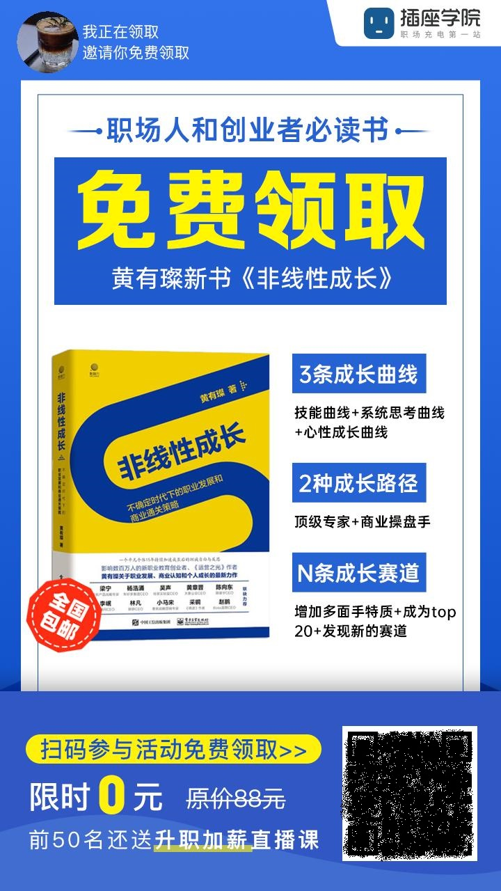 本次助力活動誘餌選取的是三節(jié)課聯(lián)合創(chuàng)始人黃有璨老師的新書《非線性成長》,前期黃有璨老師已經(jīng)為這本書做了大量的宣傳,此時插座學院用這本書作為裂變引流活動的誘餌,在無形之中借了一輪黃有璨老師的勢,為本次裂變活動增分不少。