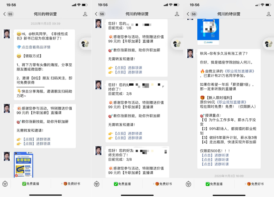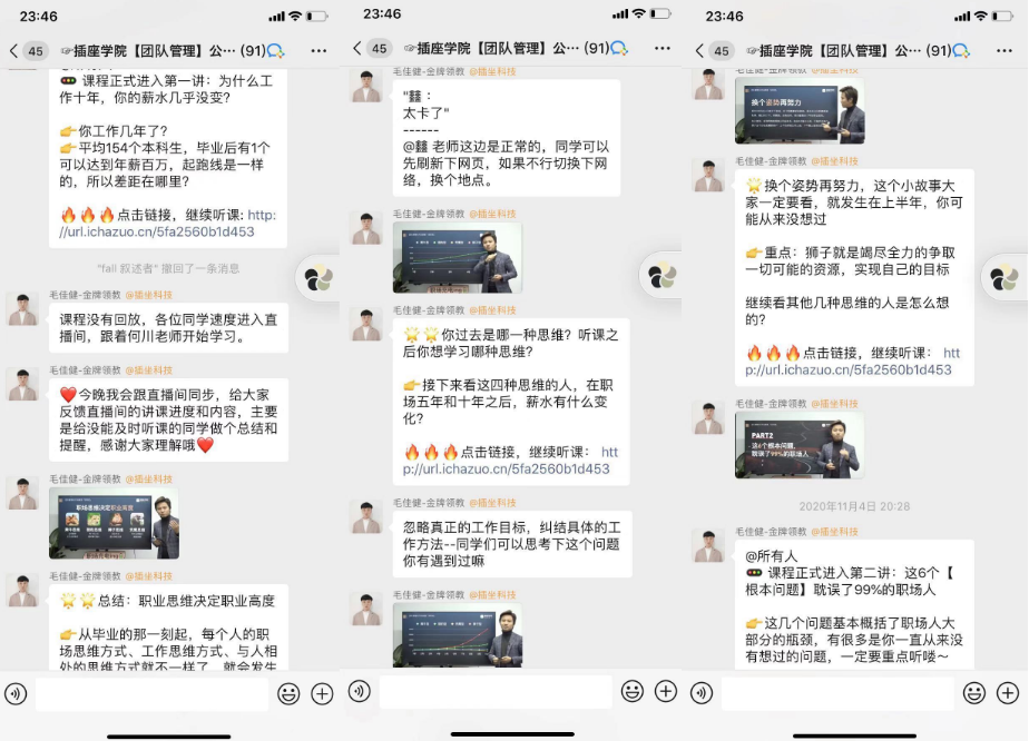 11/3號免費報名進群,11/4號群內(nèi)就開始分享課程,最短時間內(nèi)引導用戶學習,避免用戶學習熱情的下降,同時采取課堂直播+群內(nèi)圖文同步分享的形式,讓關注群信息的同學可以觀看直播課程,同時對于沒時間看直播的同學,也可以時候采取爬樓的形式回看課程分享的內(nèi)容。