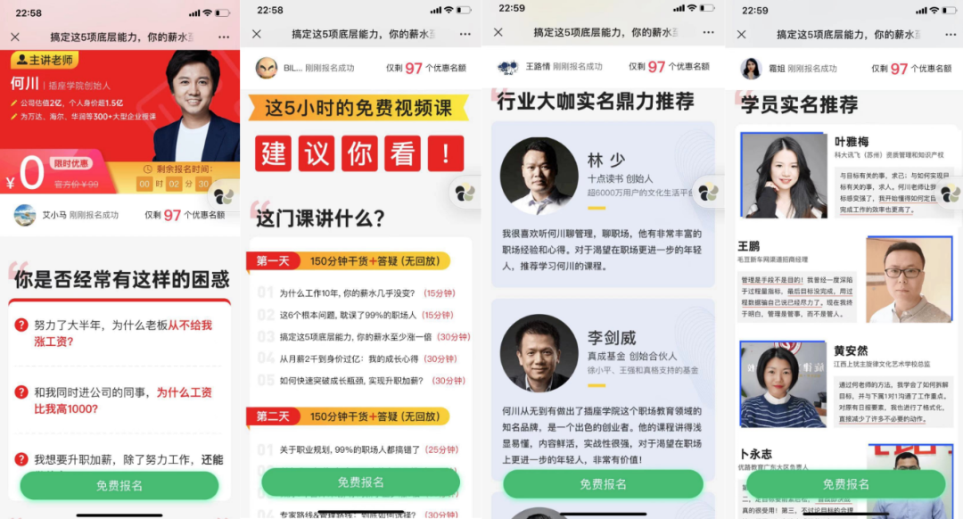 在這場活動中,用戶在點擊免費領課按鈕后,不是直接跳轉到群二維碼,而是會先跳轉到一個落地頁,落地頁里面通過用戶痛點梳理、課程內(nèi)容展示、主講老師介紹、頂級大咖推薦、學員實名推薦等方式,塑造課程價值,激起用戶的參與欲望,為用戶報名和進群做好鋪墊。