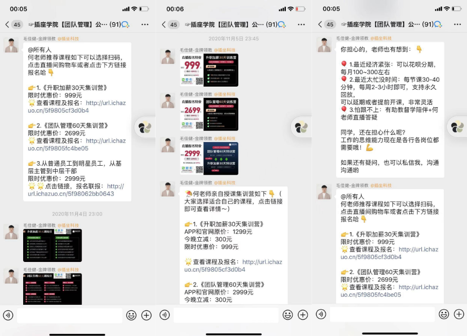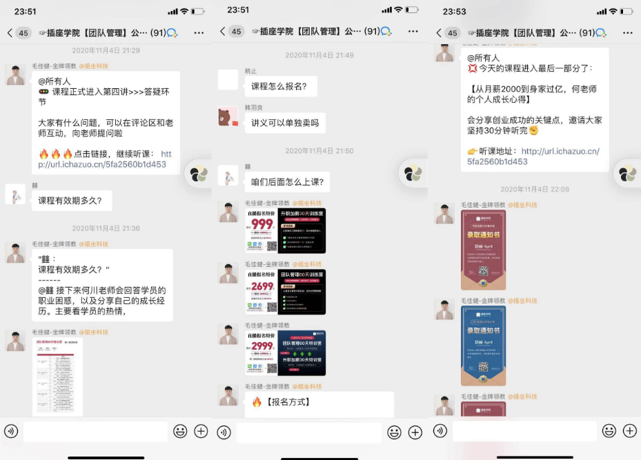 整個課程學習時間為3天(原定的2天分享+1天額外加餐分享),課程的第一天就在群內(nèi)進行了初步銷轉,利用水軍在群內(nèi)配合,引導課程相關問題的介紹,對群內(nèi)用戶進行銷轉變現(xiàn)。同時利用紅藍錄取通知書的形式,為付費用戶塑造優(yōu)越感,刺激其他意向用戶報名付費。在第二和第三天重復了第一天的操作流程,重點塑造了課程的價值,通過水軍的引導解答用戶關心的問題,并在最后一天利用工作匯報模板引導群內(nèi)未付費的用戶添加助教的微信,將用戶沉淀在個人號上面,后續(xù)進行持續(xù)銷轉。