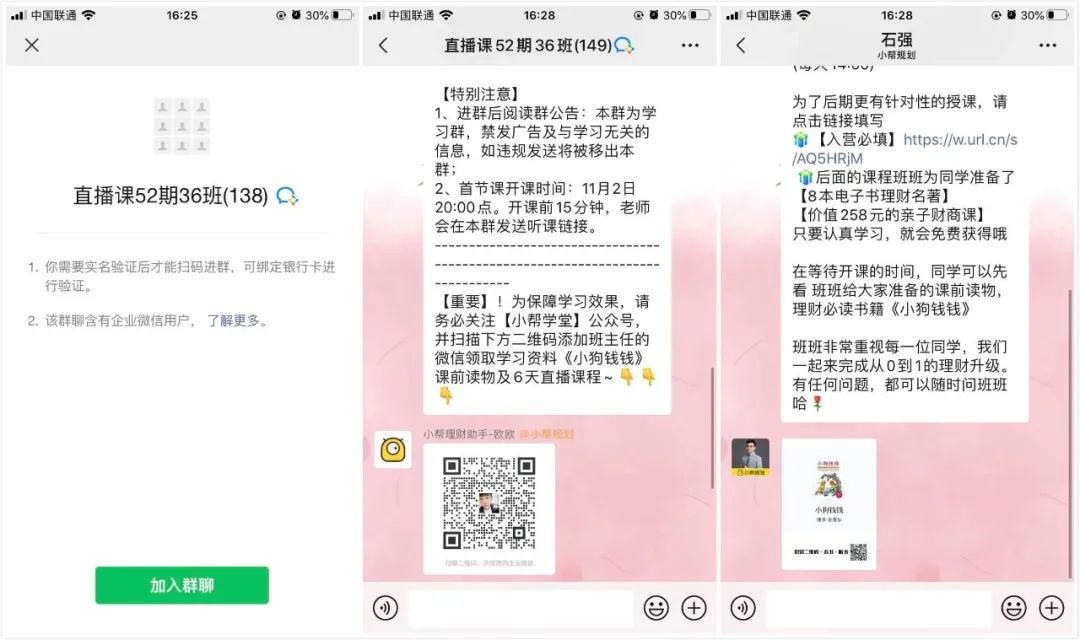 為了召回沒有點(diǎn)擊【一定要點(diǎn)擊我哦!否則助力無效】鏈接而流失的用戶,一個(gè)小時(shí)收到了3條【免費(fèi)領(lǐng)課】公眾號提醒消息。點(diǎn)擊鏈接后直接跳轉(zhuǎn)群二維碼,掃碼即可入群。為了避免流量的流失,做了雙重的保險(xiǎn)。這一步也設(shè)置的非常巧妙(崇拜,好想認(rèn)識這個(gè)活動(dòng)操盤手?。?/span>