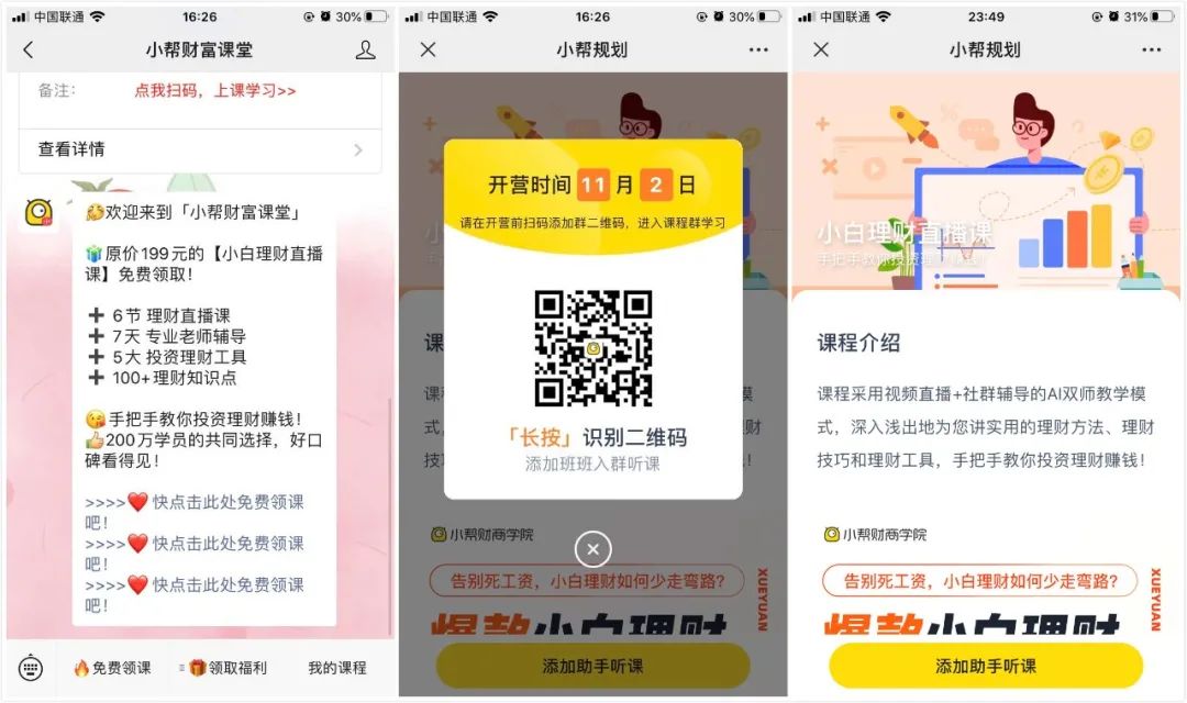設(shè)置了加班主任二維碼領(lǐng)學(xué)習(xí)資料+6天課程的鉤子