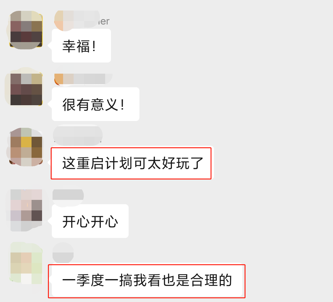 運(yùn)營(yíng)官?gòu)拇蠹业膹?fù)盤里面找到高光和金句,精選出來(lái),專門做成精美的圖簽,一份份發(fā)在群內(nèi),@對(duì)應(yīng)小伙伴。讓所有伙伴共同見證,烘托儀式感。