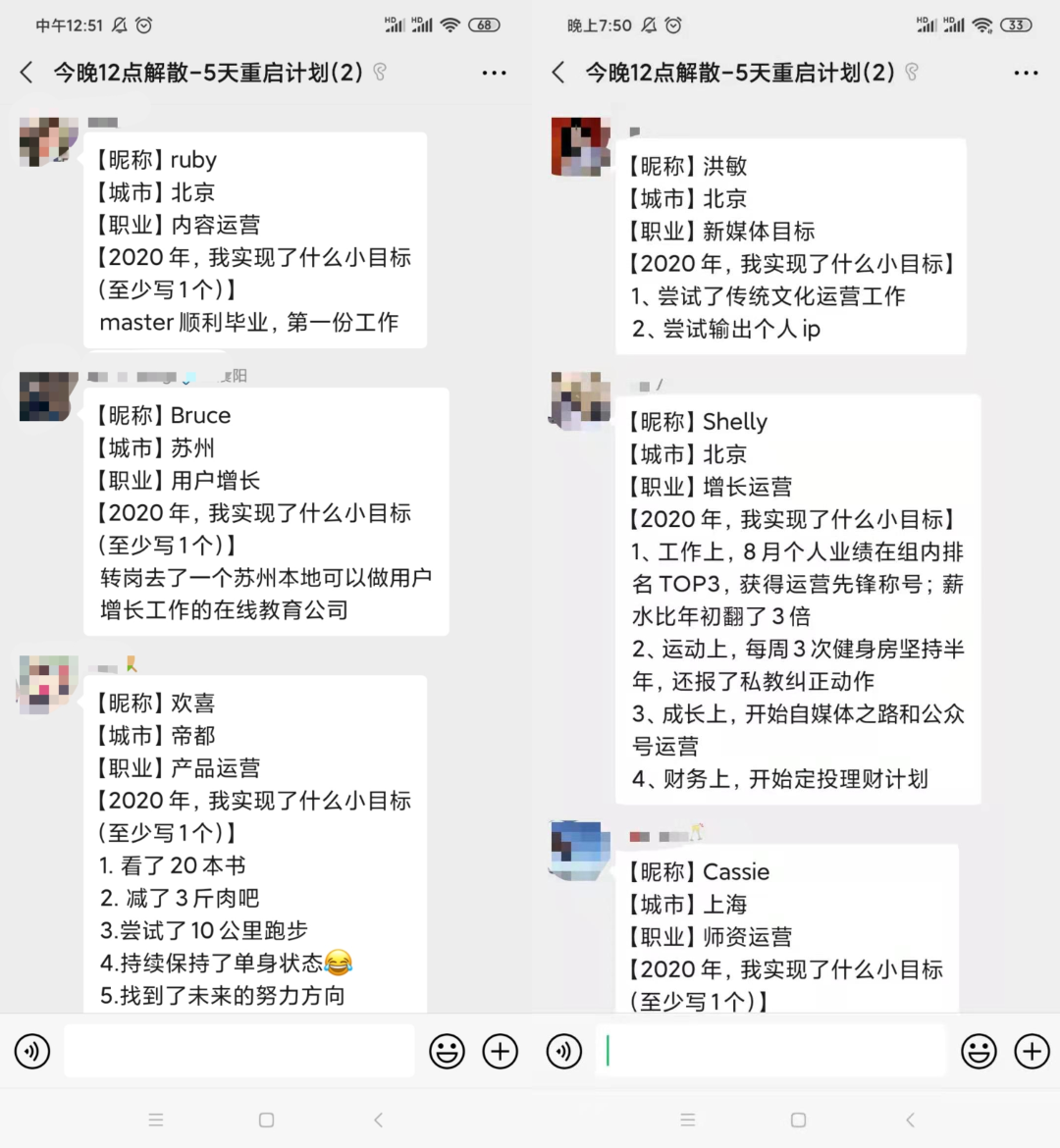 比如瘦了多少斤、工資翻了倍、買了房、生了雙胞胎、結(jié)婚戀愛各種甜蜜的……一條條自我介紹,就能讓群內(nèi)嗨聊起來(lái),破冰也迅速達(dá)到了效果。