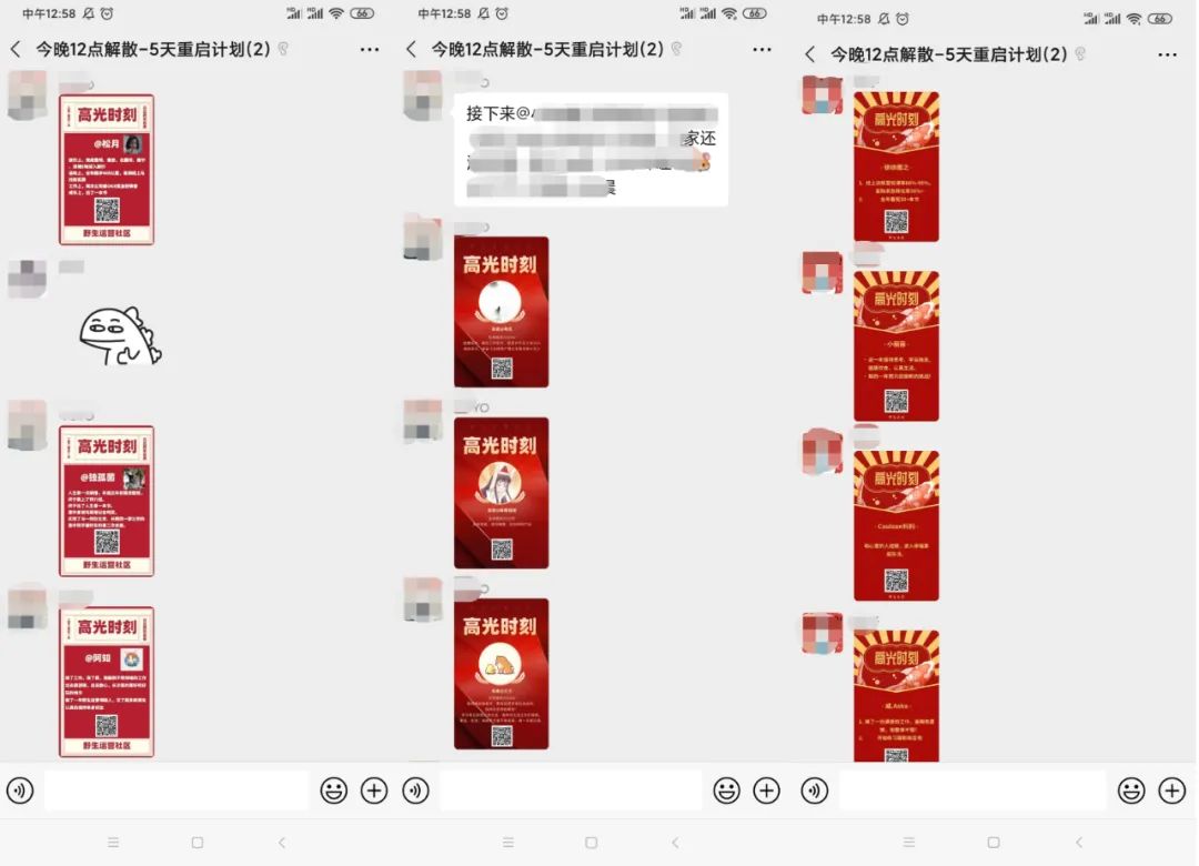 紅包活動(dòng),無(wú)論是搶還是發(fā),都容易搞起氣氛,參與感又極強(qiáng)。而大家把美好的祝愿不止寫在紅包上,也發(fā)在群里,因?yàn)槲陌该篮煤蛷谋娦睦?,很快就在群?nèi)推起了很多波刷屏。